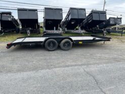 Wood Deck, Slide In Ramps, Brakes, Deck 83″W x 20’L, 3500lb Spring Axles, Tires 20575R15 Radials, 2-5/16″ Coupler, Spare Tire Mount, Removable Fenders, Beaver Tail, LED Lights, No Warranty on Paint or Wood