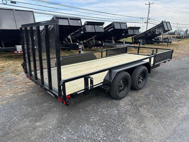 Deck 81″W x 16’L, Tube Top Rail, Rear Landscape Gate, Spare Tire Carrier, Rub Rail, Stake Pockets, Wood Deck, Boxed In LED Lights, 2 5/16″Coupler, A-Frame Jack, Tires 205/75/R15 Radials, Spring Assisted Rear Gate, EZ Lube Hubs, 3500lb Lippert Spring Axles, Side ATV Ramps 12″ W x 60″ L