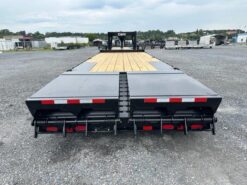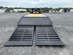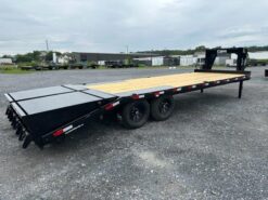 Gooseneck, Full Width Ramps 44″W x 60″L, Deck 98″W x 20’L Flat Deck Plus 5′ Beavertail, 102″ Wide With Rub Rail, Electric Brakes, 7K Spring Axles, Tires 235/80/R16 LRE, D-Rings, LED Lights, Tool Box, Dual 12K Jacks, Wood Deck