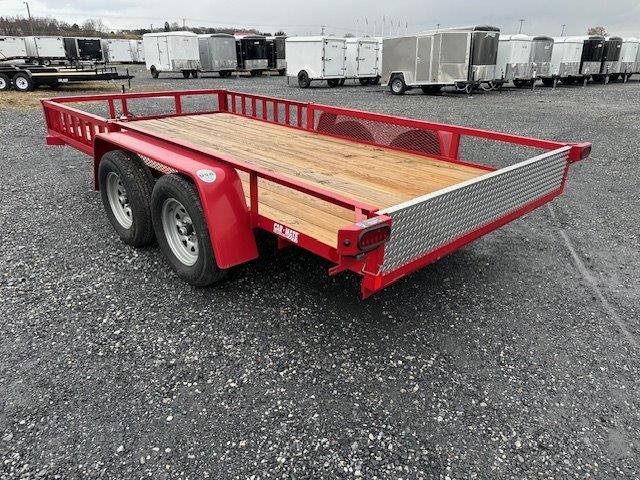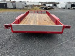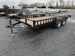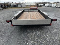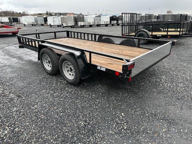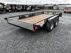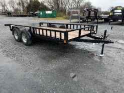 Wood Deck 80″ W x 14′ L, Removable Side Ramps 12″ W x 64″ L, Side or Rear Loading, LED Lights, Dexter Axles, Electric Brakes, Tires 205/75/R15 Radials, Rear Aluminum Diamond Plate Drop In Gate