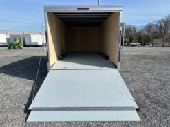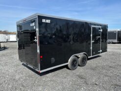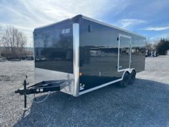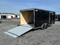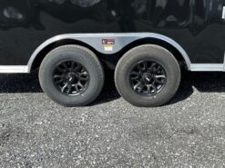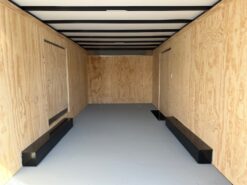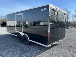 Rear Ramp Door, Side Door, Electric Brakes, Deck 96″ x 20′, Rear Door 94″ W x 76″ T, Side Door 48″ W x 76″ T, 6000lb Torsion Axles, Tires 22575R15 Radial, 2-5/16″ Coupler, 82″ Between Fenders, Beaver Tail, LED Lights, Dome Lights, Wall Vents, One Piece Roof, 3/4″ Plywood Painted Flooring, Screwless Exterior, Get Out Door 47″ W x 59″ H, 10.5″ Escape Door Clearance, Matte Black Aluminum Wheels