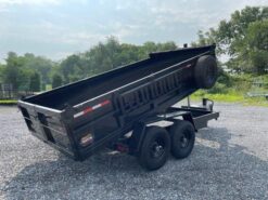 Barn Door Gate, 6′ Ladder Ramps, D-Rings, Electric Brakes, Deck 77″W x 14’L, 2′ Sides, 7000lb Leaf Spring Axles, 235/85/R15 LRG Radial Tires, 2-5/16″ Coupler, Deep Cycle Battery, Power Up, Gravity Down, Tarp Kit, Spare Tire Mount, 10 Gauge Floor, 12 Gauge Sidewalls, Battery Charger, Telescopic Cylinder, 12K Dropleg Jack, Spare Tire
