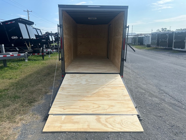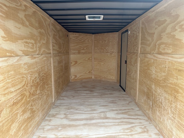 Rear Ramp Door and Side Door, Electric Brakes, Deck 80″W x 16’L Plus 20″ V-Nose, Rear Door 75″W x 77″T, Side Door 32″W x 76″T, Interior Height 83″, 3500lb Leaf Spring Axles, Radial Tires 205/75/R15, 2 5/16″ Coupler, V-Nose, Roof Vent, Wall Vents, EZ Lube Hubs, 3/4″ Floor, 3/8″ Walls, Dome Light, LED Lights, 12″ Added Height, Black Trim